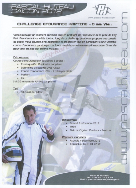 Afin de vous aider à passer l'intersaison sans perdre le contact avec le sport auto, Pascal vous propose une endurance karting le 8 décembre prochain sur la piste CityKart outdoor de Sautron.