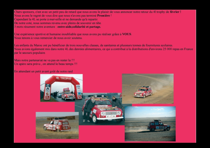 Depuis le 14 février , Les Blondes des Sables participe à la course 4 L Trophy . Avec le logo de Ô ma vie sur leurs voiture, nous leurs souhaitons bonne chance et un grand bravo .