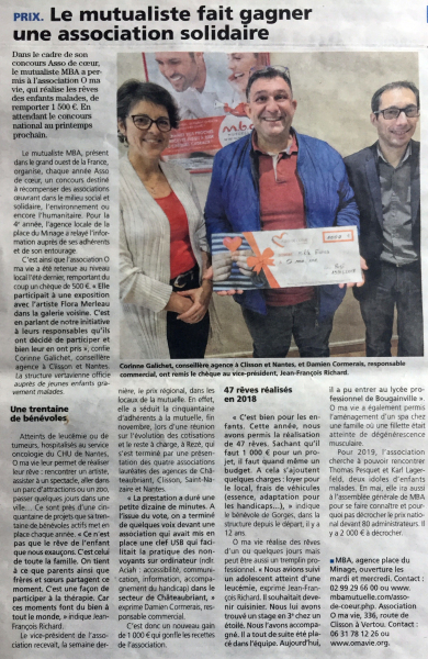 L’association Ô Ma Vie pourra réaliser un rêve d’enfants malades supplémentaire grâce au Prix Asso de Cœur d'un montant de 1 000 € remis par Jean-Louis Rothureau, Président de la Section Locale Pays de Loire et Stéphane Lebret , Directeur Général de Mba Mutuelle.