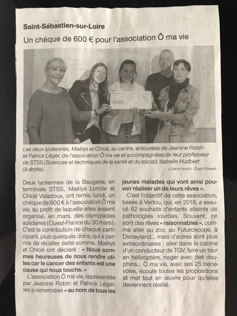 remise de chèque par Maëlys et Chloé du lycée de La baugerie