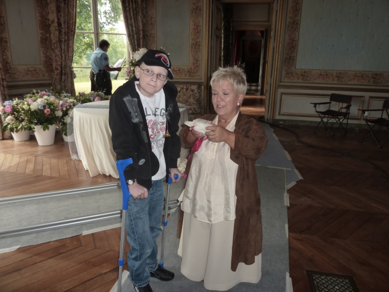 Sur le tournage avec Mimie Mathy journée de pluie mais de bonheur pour Thomas.Approcher son idole était la récompense de la fin de sa chimio.