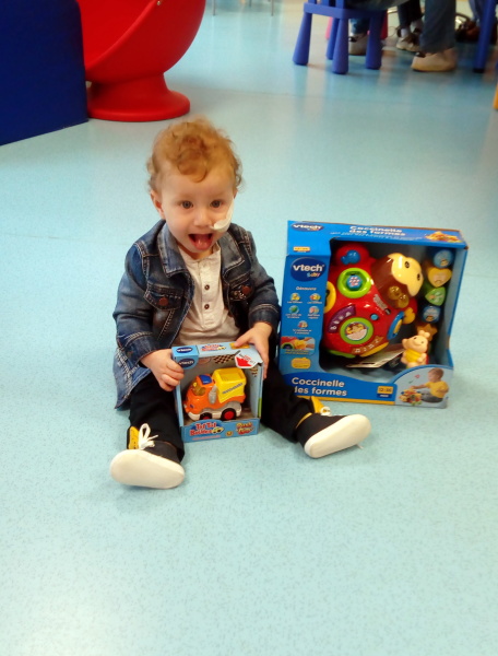 Ce petit cœur de rêve a montré sa joie devant les jeux d'éveil, pleins de lumière et de sons, il les aurait mangé tellement il était content, il les voulait pour lui tout seul, ses cris, ses expressions, sa joie de vivre, malgré les petites misères de la maladie, tout était oublié, ce n'était que du bonheur, partagé avec sa maman qui ne le quittait pas des yeux ....