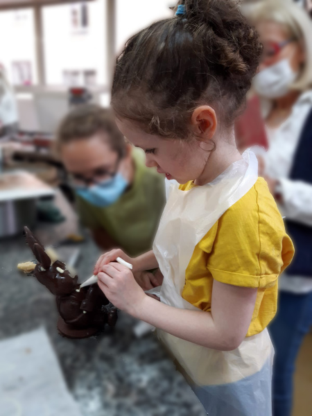 Mais ce n’est pas terminé pour Nahia, elle connaît l’origine des fèves de cacao qui viennent du bout du monde et qui sont torréfiées… De ce fait, elle a conclu son rêve en compagnie de Pauline la spécialiste du chocolat à la Petite Boulangerie et a fabriqué un beau Lapinou en chocolat avec des cheveux frisés en pâte d’amande, réalisés par notre petite artiste qui n’a pas manqué de concentration, d’attention pendant la durée de son rêve.