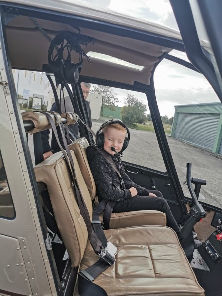 Accompagné de sa maman et de sa petite sœur Chloé, il a pris place auprès du pilote de l’hélicoptère R44.